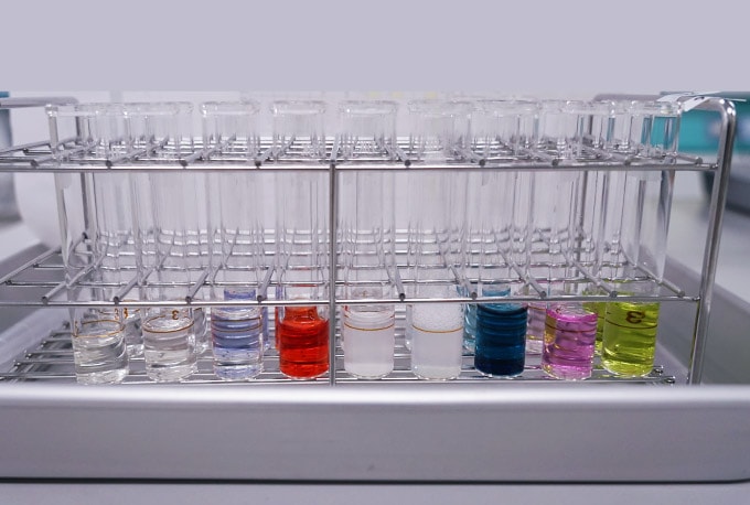 専用の薬品を入れると、成分の量によって色の濃さが変化します。